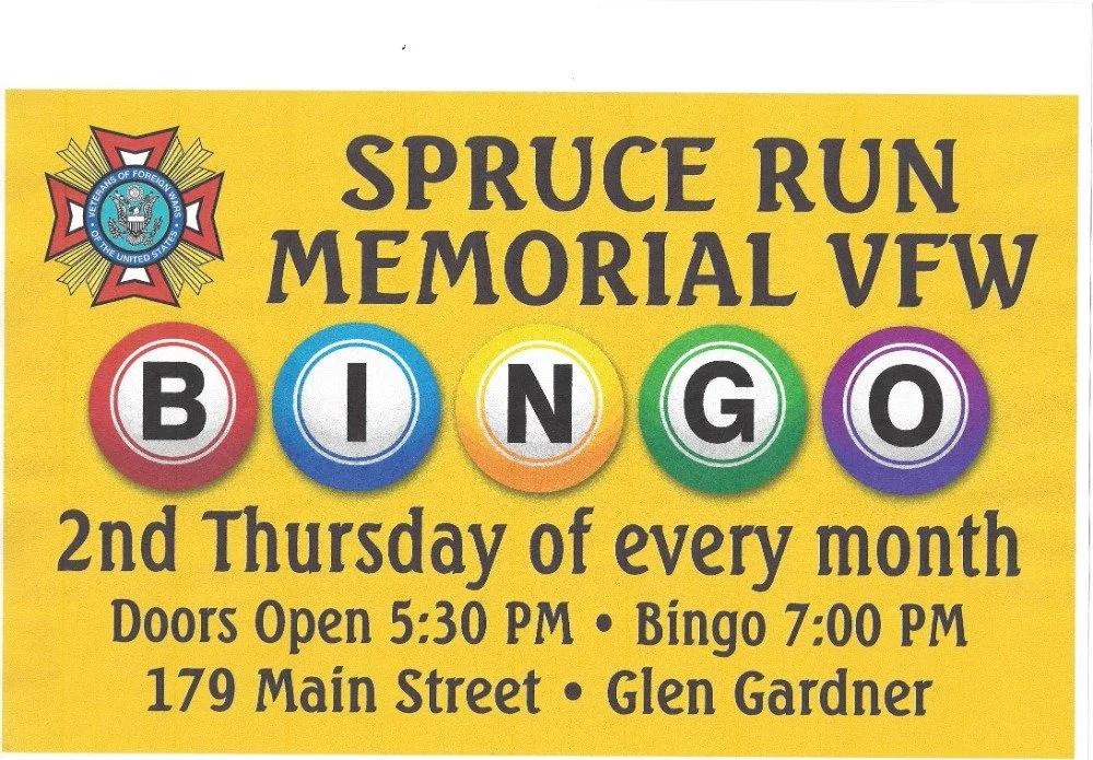 Bingo, Thursday, 11/13 at the Spruce Run Memorial VFW. Doors open to the public (over 18 years old) at 5:30 with food and snacks available for purchase. Bingo begins at 7pm. First set of boards cost $10 and additional boards for the same player are $6. We have two 50/50 games at $1 each and we sell five different pull tab games for $1 each. Cash prizes to winners vary from $50 to $300 depending on the game. All proceeds support the Spruce Run Memorial Post 5119, 179 Main Street, Glen Gardner, NJ.
